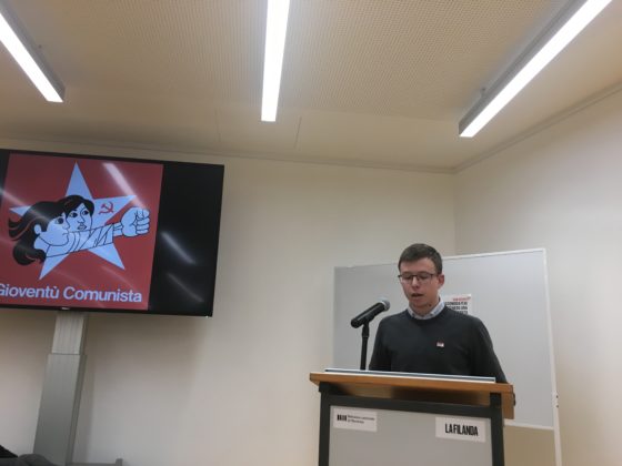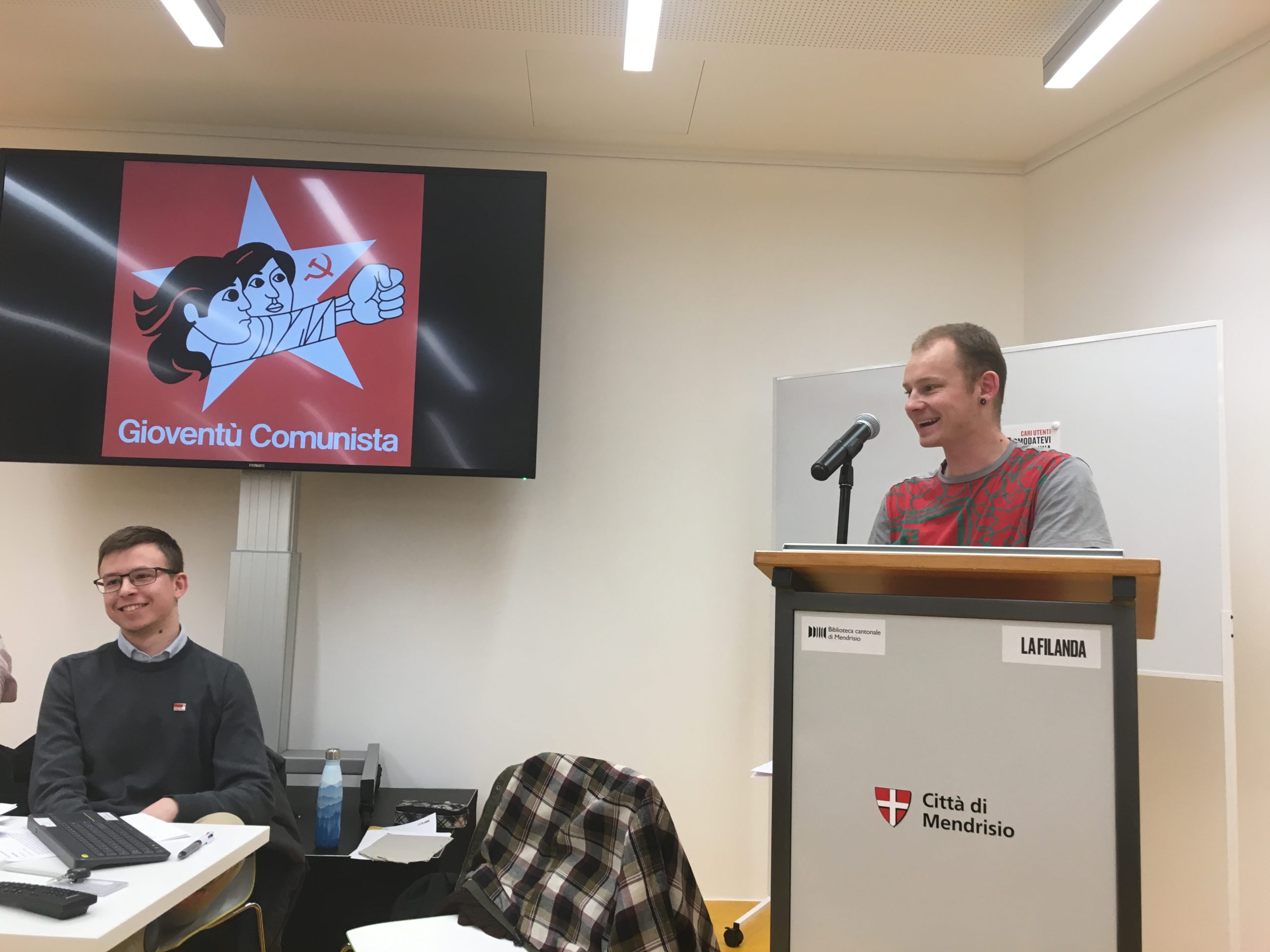 Sabato 7 marzo si è riunita alla Filanda di Mendrisio l’assemblea della Gioventù Comunista. Il piatto forte all’ordine del giorno era il rinnovamento del proprio coordinamento: all’unanimità è stato eletto il 21enne luganese Luca Frei quale nuovo coordinatore. Luca Frei, classe 1998, abita nel quartiere di Cadro a Lugano e studia storia e diritto all’Università di Friborgo e sarà candidato al Consiglio comunale di Lugano il prossimo aprile sulla lista PS-PC.