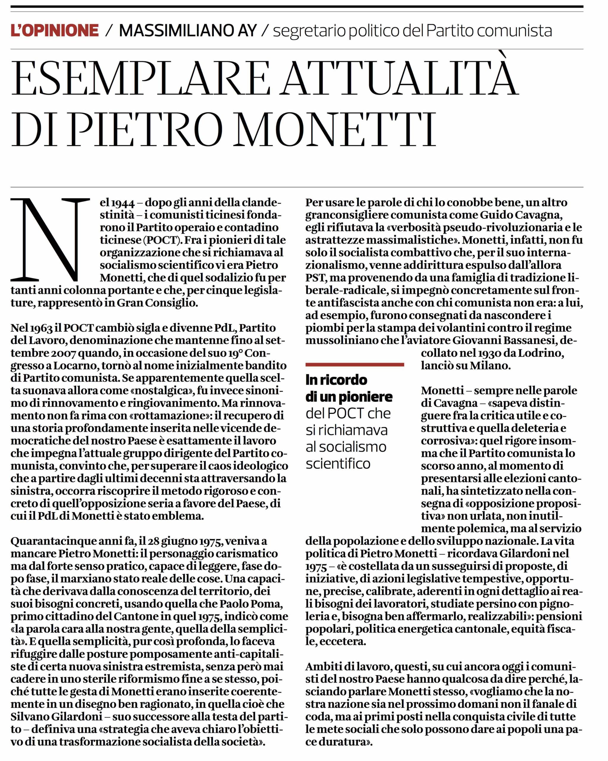 Il segretario politico del Partito, Massimiliano Ay, ricorda poi la figura di Pietro Monetti in un articolo apparso venerdì 27 giugno 2020 sul Corriere del Ticino e ripreso oggi sul portale Sinistra.ch.