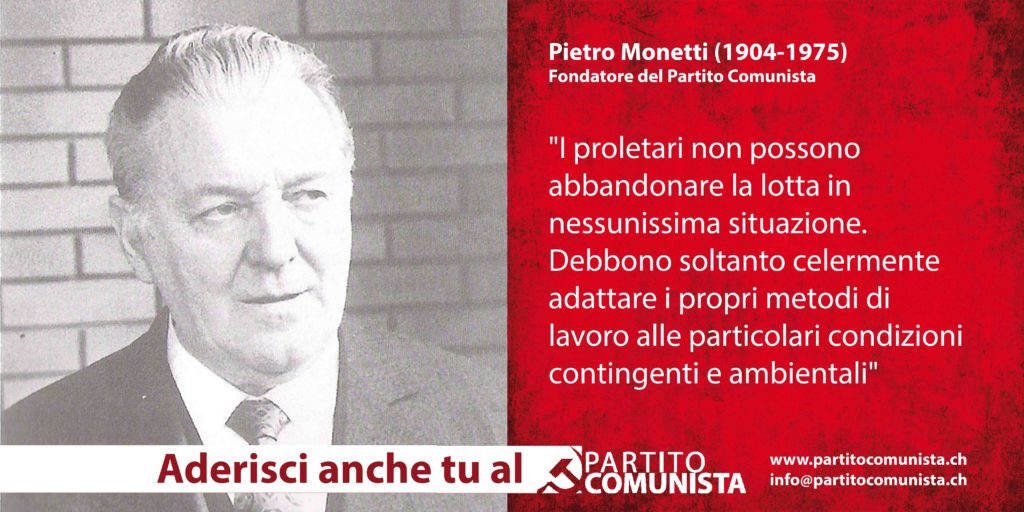 Nel 45° anniversario della sua scomparsa, avvenuta il 28 giugno 1975, il Partito Comunista ricorda il proprio fondatore Pietro Monetti, per lunghi anni unica voce comunista nel Gran Consiglio ticinese, in cui sedette per cinque legislature. Per oltre un trentennio instancabilmente al servizio dei lavoratori e del Paese, Monetti fu anche municipale di Mendrisio e poi consigliere comunale, oltre che uno dei principali esponenti del movimento operaio svizzero.