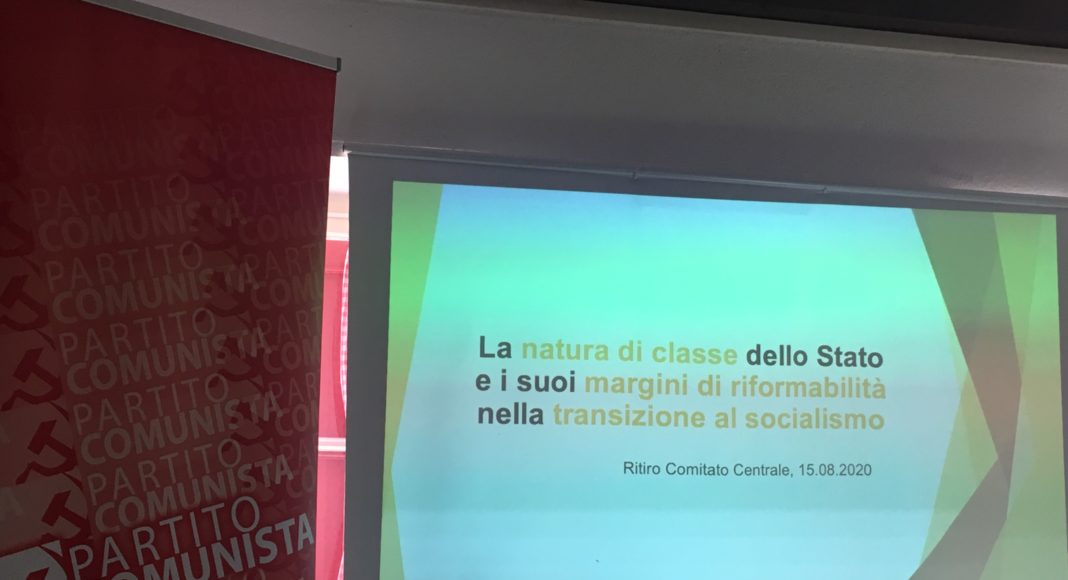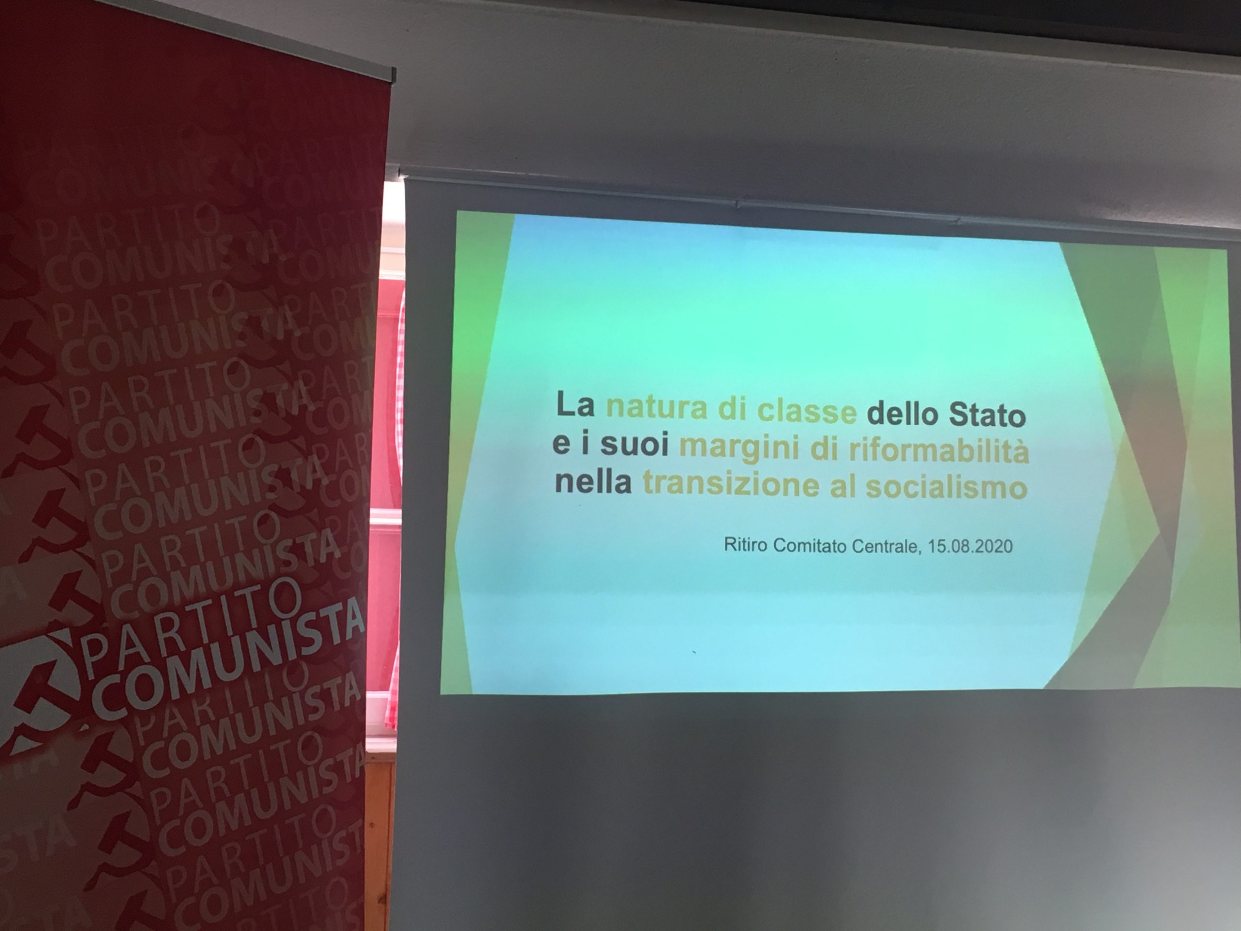 La relazione conclusiva di competenza del compagno Massimiliano Ay, segretario politico, verteva sullo stato del Partito e soprattutto sulle prossime sfide dal lato della politica organizzativa. Partendo da alcune citazioni del libro di Palmiro Togliatti intitolato “La formazione del gruppo dirigente del Partito Comunista Italiano nel 1923-1924”, il Segretario ha voluto anzitutto provare anche autocriticamente a ragionare sul nostro lavoro di ricostruzione e di radicamento di una soggettività marxista negli ultimi anni. La situazione interna al Partito, caratterizzata da una bella campagna di tesseramento riuscita nonostante il lockdown, registra – accanto ad aspetti molto positivi come le nostre eccellenti analisi che anticipano le dinamiche internazionale e geopolitiche e la nostra buona capacità di cogliere con senso politico le contraddizioni nel campo borghese rifuggendo da atteggiamenti settari o puristi – limiti che occorre capire come superare: in primis occorre istruire meglio i compagni sulla strutturazione del Partito, sulla sua disciplina interna, a favore di una migliore e più razionale collocazione dei militanti, a tutto vantaggio anche del senso di appartenenza a un collettivo. Il Segretario ha insistito sulla necessità di farci riconoscere attraverso le nostre idee positive alla popolazione, sottolineando la “funzione di massa” che dobbiamo avere benché noi ci si riconosca come “Partito di quadri” e di conseguenza a non permettere ad altri di interferire nella nostra indipendenza, né di costruire, distorcendola, la nostra immagine. Il Segretario ha pure insistito sulla necessità di superare modalità non sufficientemente ordinate delle discussioni negli organisimi dirigenti e ha ritenuto opportuno riprendere l’insegnamento di Mao, secondo il quale il Comitato Centrale deve rappresentare una fabbrica che trasforma le materie grezze che arrivano dalla base, ma ciò presuppone un sistema di consultazione dei militanti e dei simpatizzanti che sia più performante di quello che abbiamo ereditato dal passato.