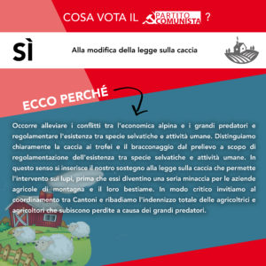 Il Partito Comunista si pronuncia a favore della revisione della legge sulla caccia il prossimo 27 settembre. Non temiamo un accanimento sulle specie protette, anzi l’impostazione della legge contribuisce ad alleviare i conflitti tra l’economica alpina e i grandi predatori. Infatti il Parlamento ha già deciso che non si deve intervenire sulle popolazioni di castoro, lince, airone cenerino e smergo maggiore. Pertanto, possono essere regolati soltanto i branchi di lupi, che rappresentano una seria minaccia per i contadini di montagna e tutta l’economia alpina.