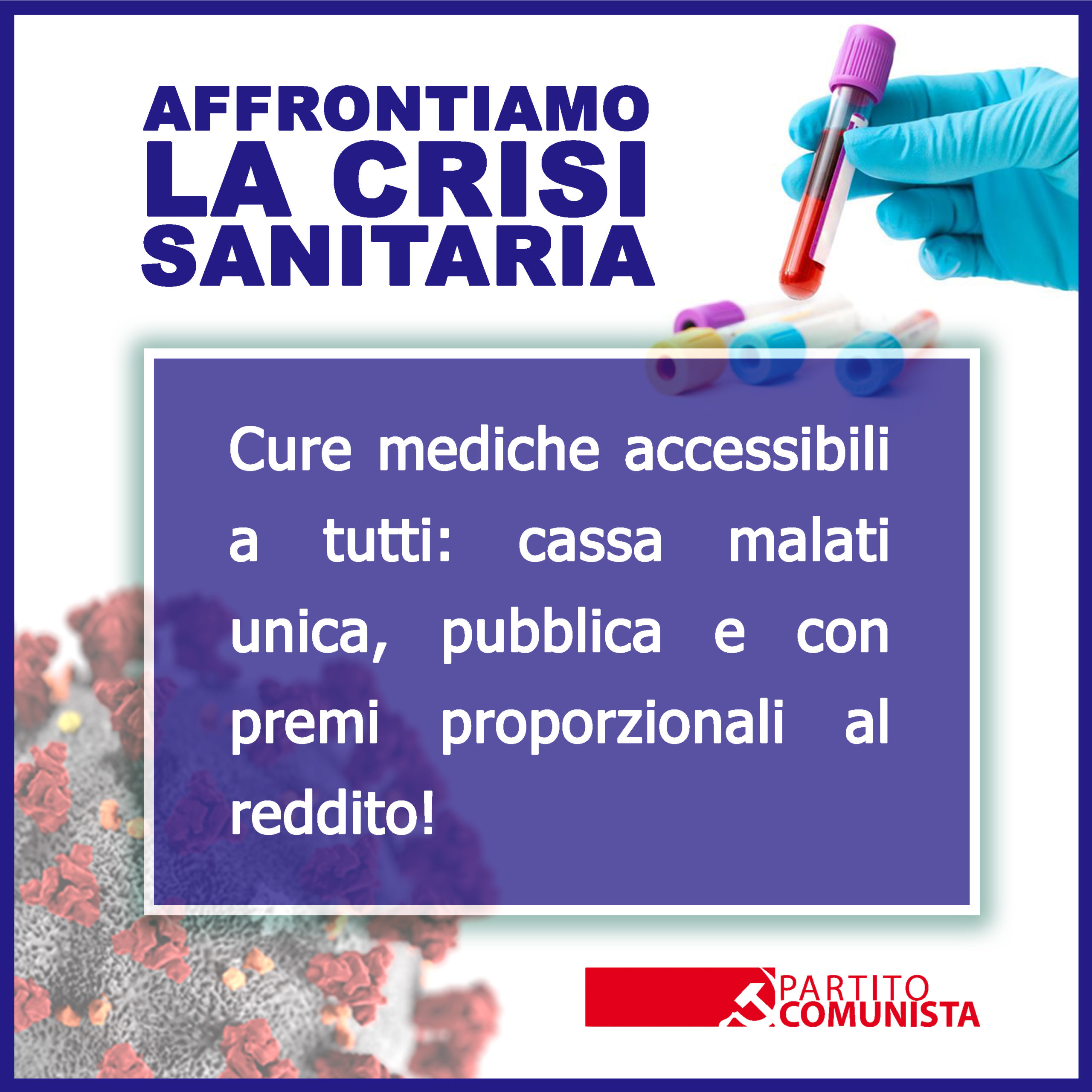Per affrontare il problema alla radice, occorre tuttavia che il sistema sanitario venga finalmente sottratto dalle logiche privatistiche e di mercato che attualmente lo pervadono. Nel solco delle precedenti considerazioni, come Partito Comunista ribadiamo pertanto la nostra priorità: una cassa malati unica, pubblica con i premi calcolati in base al reddito e alla sostanza!