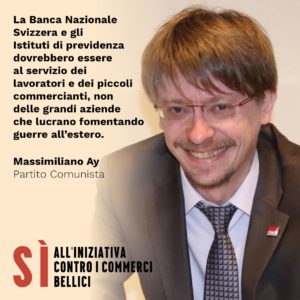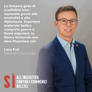 Il prossimo 29 novembre saremo chiamati a votare sull’iniziativa popolare «Per il divieto di finanziare i produttori di materiale bellico», la quale intende in sostanza impedire alla Banca nazionale svizzera (BNS), agli istituti della previdenza statale e alle casse pensioni di sovvenzionare l’industria degli armamenti. Nell’ottica di arginare lo sperpero di denaro nell’apparato bellico, di promuovere una politica attiva a favore della pace e di rilanciare gli investimenti pubblici nei settori più strategici, il Partito Comunista sostiene pertanto con decisione la modifica costituzionale.
