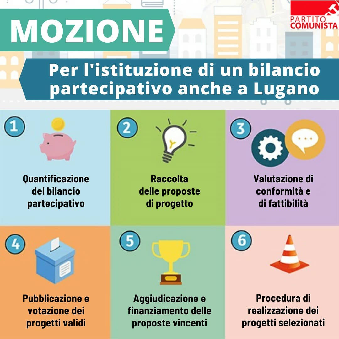 Come spiegato in precedenza, non può esservi un modello unico di bilancio partecipativo. Sulla base delle esperienze sviluppate in diversi contesti, quanto sopraesposto permette tuttavia di delineare un’impostazione di massima per questo strumento anche a livello comunale. Del resto, vale la pena constatare come anche in Svizzera gli stessi Comuni di Losanna, Friburgo (e Wipkingen) stiano muovendo in questa direzione con un particolare successo. Per avere una visione più approfondita sulle procedure adottate in queste realtà, nonché sui numerosi progetti finanziati e proposti dalla cittadinanza, ci permettiamo pertanto di rimandare alla documentazione allegata alla mozione.