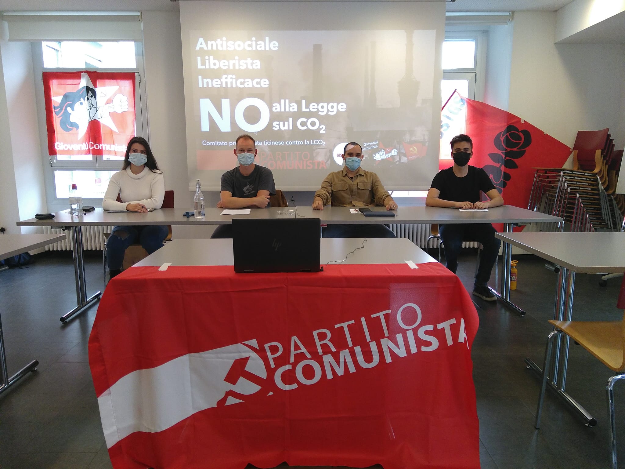 Lunedì 10 maggio si è presentato in conferenza stampa a Bellinzona il comitato progressista ticinese contro la legge sul CO2. Composto da Partito Comunista, Gioventù Socialista, Gioventù Comunista e Partito Operaio Popolare, il comitato ha presentato di fronte ai media le ragioni per cui – anche da sinistra – si invita a votare NO alla riforma della legge sul CO2 in votazione il prossimo 13 giugno.