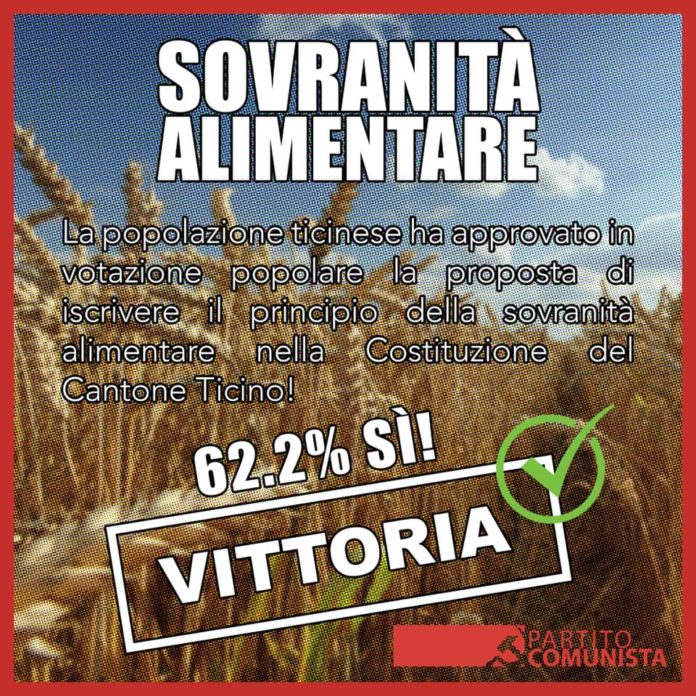 L’inserimento fra gli obiettivi sociali (art. 14) della Costituzione cantonale del principio della sovranità alimentare, come richiesto nel 2018 dall’iniziativa parlamentare di Massimiliano Ay a nome del Partito Comunista e come deciso oggi dal popolo ticinese, è un’importante conquista, a favore del settore primario e dell’autoaprovvigionamento alimentare del Paese: la Svizzera produce infatti una proporzione molto bassa di derrate alimentari utili al proprio fabbisogno: siamo quindi non solo molto vulnerabili alle oscillazioni del mercato ma dipendiamo troppo dall’estero per nutrirci, come anche la pandemia (con il relativo blocco del commercio e la chiusura delle frontiere) ha dimostrato.