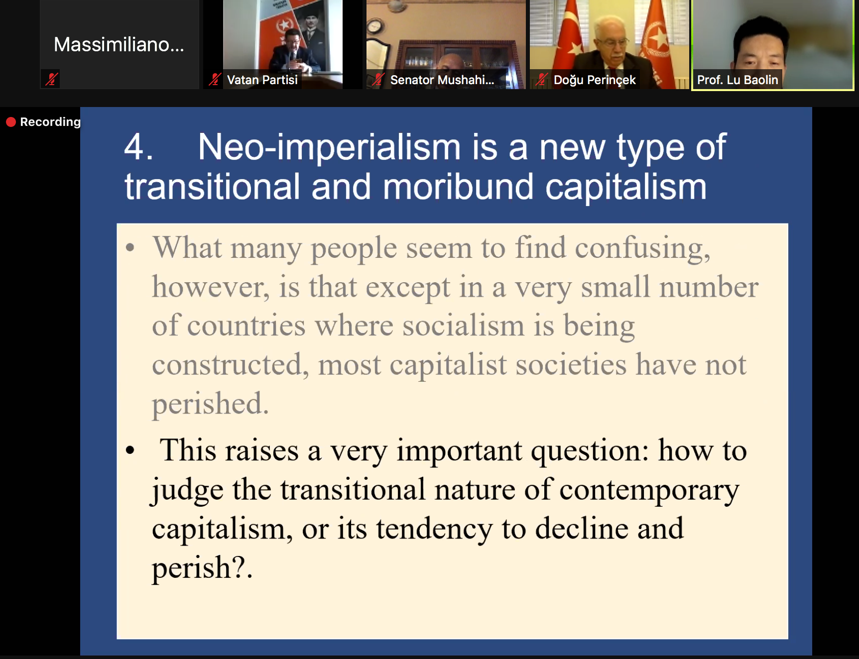 L’evento si è aperto con un saluto di Dogu Perinçek, leader della corrente filo-cinese della sinistra rivoluzionaria turca, che ha spiegato che ci troviamo nell’epoca delle rivoluzioni nazional-democratiche, che saranno patriottiche ma non chiuse entro i confini nazionali, e che con esse si aprono nuove prospettive per il socialismo. Dopo Perinçek, e non a caso, hanno preso la parola Zheng Dongchao in rappresentanza del Comitato Centrale del Partito Comunista Cinese e Lu Baolin dell’Università di Fujian: quest’ultimo in particolare ha analizzato le caratteristiche dell’attuale fase storica rinnovando la teoria leninista dell’imperialismo.