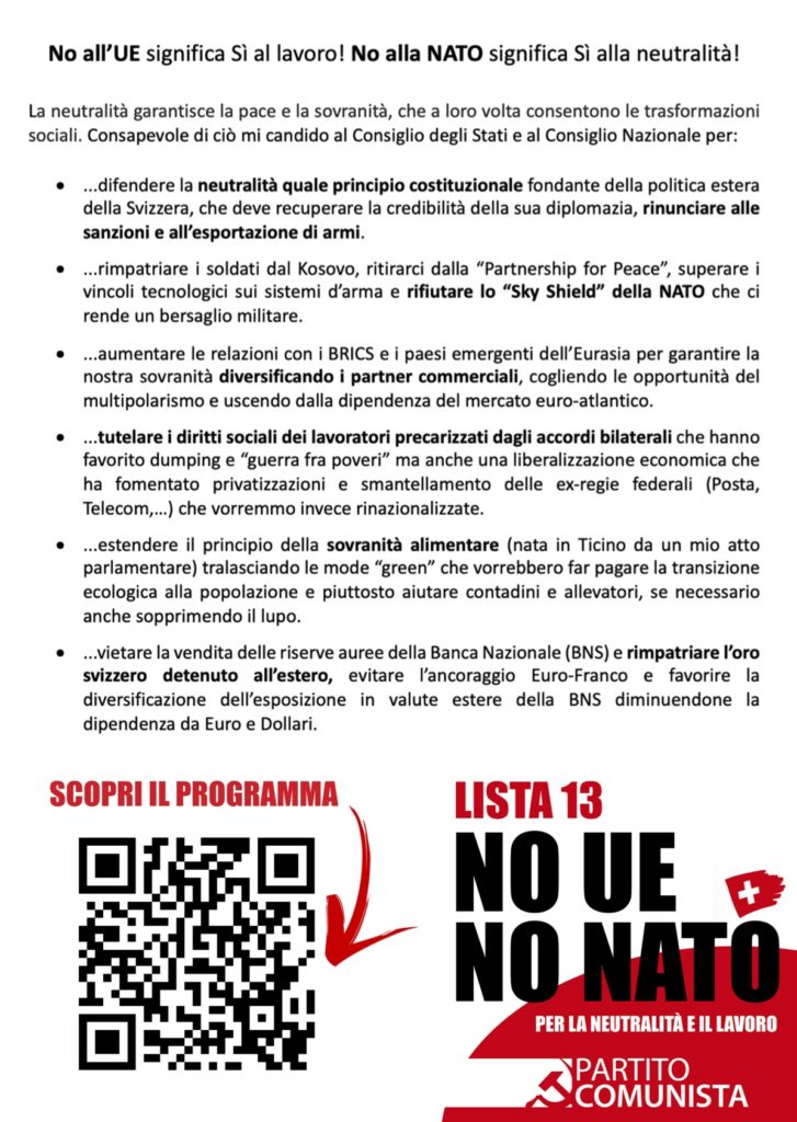 Il Partito Comunista e il suo candidato Massimiliano Ay rappresentano l’unica sinistra che – continuando a difendere i diritti sociali e del lavoro – rifiuta l’atlantismo e si colloca a favore del multipolarismo e della cooperazione pacifica con le nazioni emergenti; che resta contraria alla forsennata corsa al riarmo e alla rottamazione della nostra neutralità e che non accetterà mai non solo l’esportazione di armi a un paese in guerra, ma anche l’integrazione alla NATO e l’adesione all’UE.