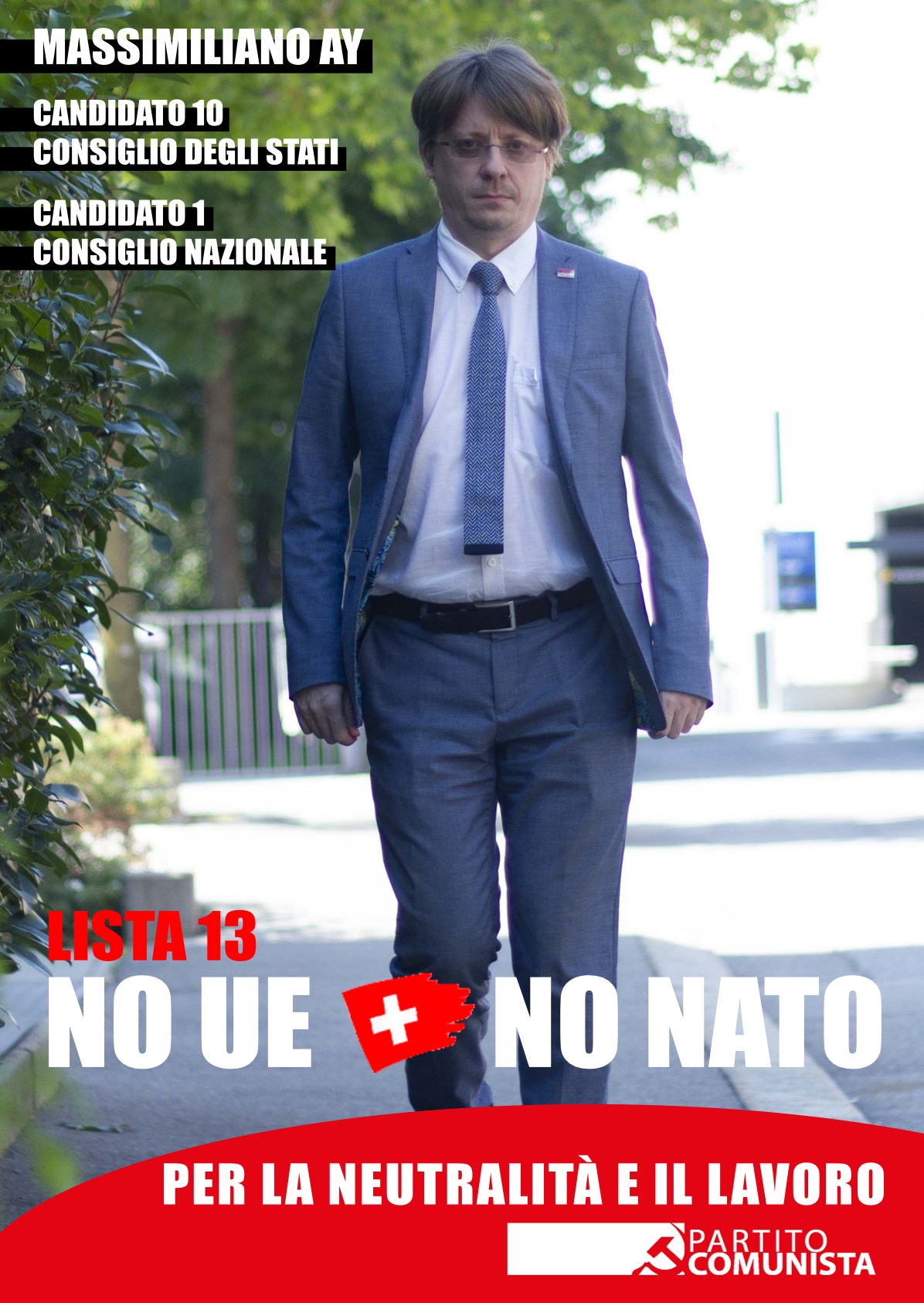Il Partito Comunista ha deciso che – oltre a una lista denominata “No UE – No NATO” al Consiglio Nazionale – in vista delle elezioni federali di ottobre si presenterà anche con un proprio candidato al Consiglio degli Stati. Dopo consultazione interna, avendo stabilito come priorità la difesa della neutralità svizzera da sinistra, la scelta è caduta sul proprio segretario politico Massimiliano Ay, deputato in Gran Consiglio dal 2015.