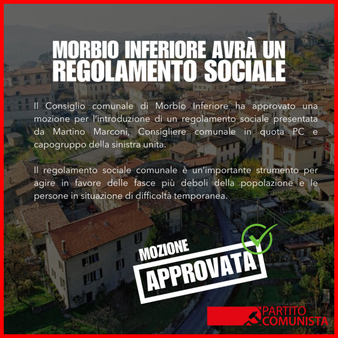La Sezione Mendrisiotto del Partito Comunista si felicita della notizia dell’accoglimento della mozione per l’istituzione di un regolamento sociale comunale da parte del Consiglio comunale di Morbio Inferiore. La mozione, presentata da Martino Marconi, responsabile della Sezione Mendrisiotto del PC e capogruppo della sinistra nel Consiglio comunale di Morbio, ha saputo raccogliere attorno a sé un consenso trasversale a favore delle fasce più bisognose della popolazione; la palla passa ora al Municipio, che dovrà elaborare un regolamento sociale, con lo scopo di sostenere le persone in situazione di bisogno temporaneo favorendo l’integrazione sociale e l’uscita dal circolo vizioso dell’assistenza cantonale.