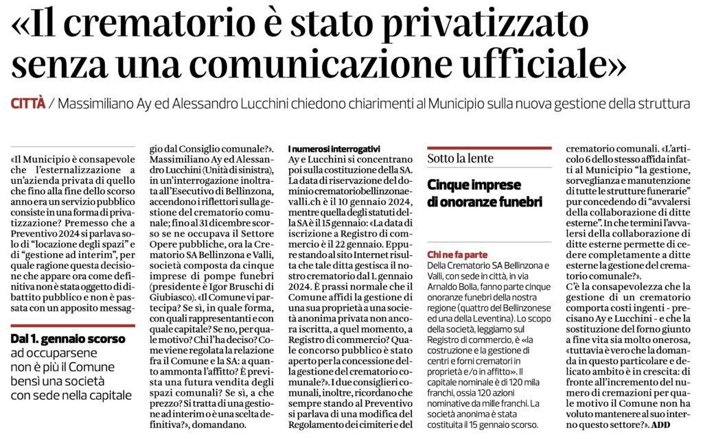 Il Municipio di Bellinzona, fra gli altri compiti, si occupa “dei Cimiteri e crematorio-obitorio comunale”. Così si legge sul sito della Città (stato: 22 marzo 2024). Eppure il sito https://crematoriobellinzonaevalli.ch/ (vedi immagine allegata) riporta che dal 1° gennaio 2024 la ditta Crematario SA Bellinzona e Valli “ha ripreso la gestione del crematorio comunale di Bellinzona che fino al 31 dicembre 2023 era gestito dai Servizi Opere Pubbliche della Città”.