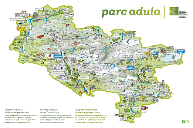 Il 27 novembre le popolazioni di 17 comuni di cinque regioni rurali tra Ticino e Grigioni (Serravalle, Acquarossa, Blenio, Medel, Disentis, Sumvitg, Trun, Vrin, Vals, Hinterrhein, Nufenen, Splügen, Mesocco, Soazza, Rossa, Calanca, Buseno) si esprimeranno in votazione sulla creazione di un parco d’importanza nazionale che prende il nome di Parc Adula. Secondo l’Ordinanza sui parchi (OPar), un Parco nazionale è composto da una zona centrale, caratterizzata da un regolamento di protezione della natura, e una zona periferica, dove non ci sono restrizioni ed anzi si promuovono le attività economiche. Durante la fase di progettazione la zona centrale è stata fortemente ridimensionata secondo le esigenze di agricoltori, cacciatori e proprietari di rustici e non interferisce quindi in nessuna maniera con la libera fruizione del territorio. Il progetto di Parc Adula è nato in forma partecipata e vincolerà la regione per 10 anni, scanditi da una programmazione quadriennale che nel periodo 2016-19 prevede un investimento di 15 milioni di Fr. finanziato per il 60% dalla Confederazione, per il 20% dai Cantoni Ticino e Grigioni e per il restante 20% dai Comuni, dalle Regioni e da sponsor privati.