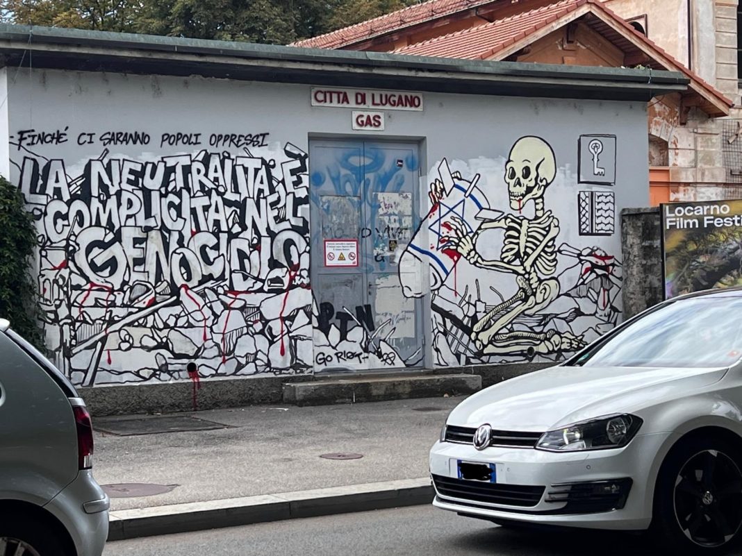 Ho letto sul portale TicinOnline un articolo della redazione in merito a un graffito apparso a Lugano. Su quest’ultimo leggiamo una critica alla neutralità svizzera, la quale – a detta degli autori del graffito – sarebbe complice del genocidio del popolo palestinese che Israele sta perpetrando da quasi due anni nella Striscia di Gaza e non solo. L’articolo proseguiva con la risposta di Lorenzo Quadri, il quale ha liquidato la questione definendola “un mero atto di vandalismo”.