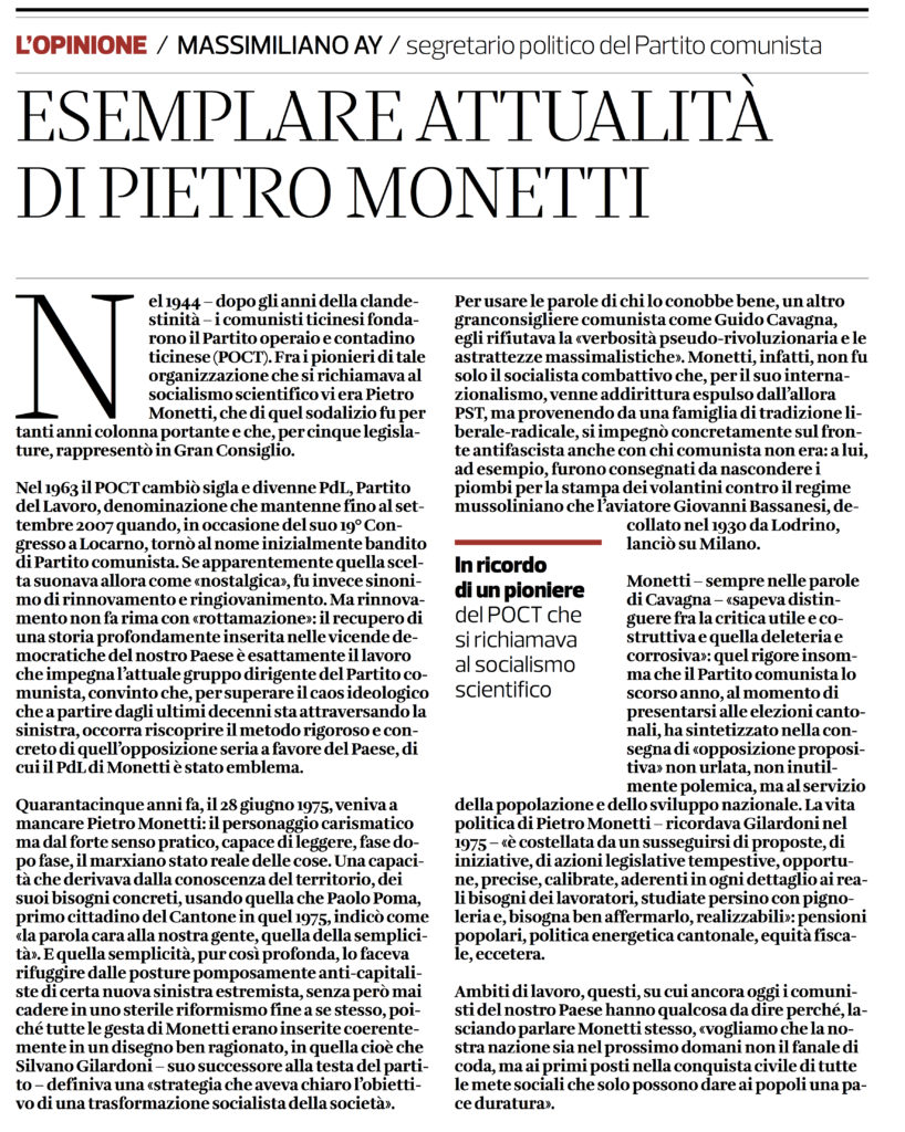 Il segretario politico del nostro Partito, Massimiliano Ay, ricordò la figura di Pietro Monetti in un articolo apparso venerdì 27 giugno 2020 sul Corriere del Ticino che qui riproduciamo:
