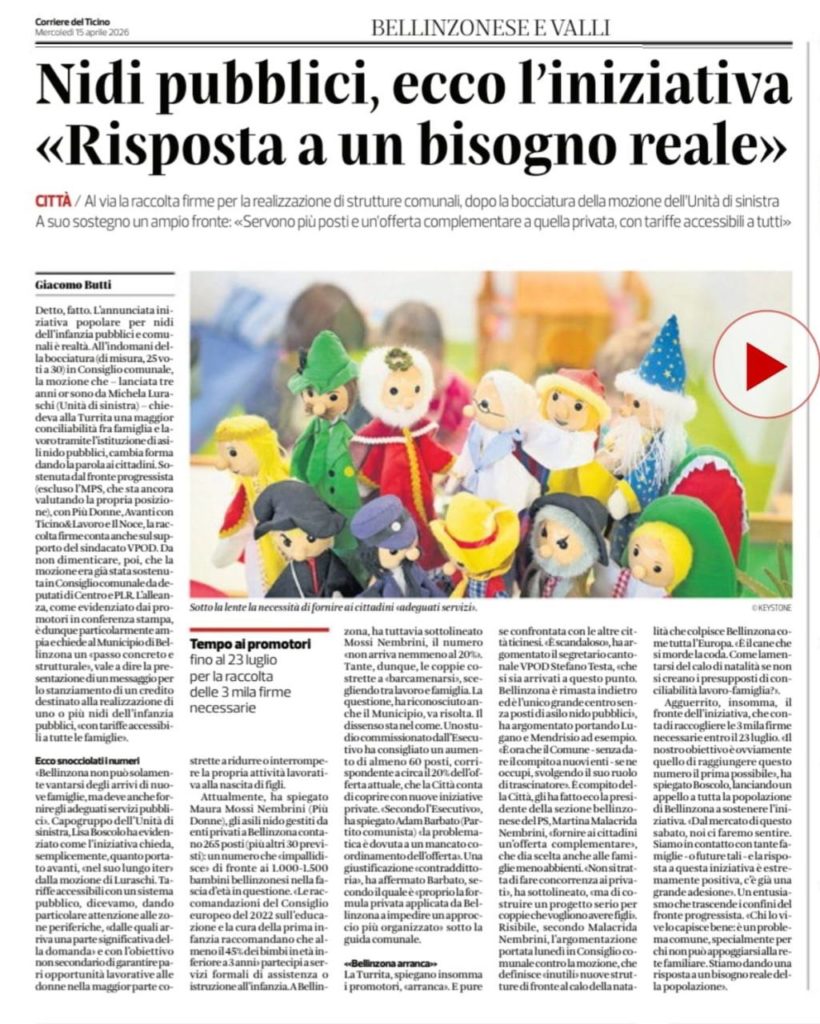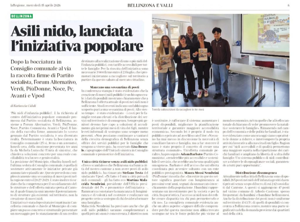 Martedì 14 aprile 2026 è stata depositata presso la Cancelleria comunale di Bellinzona l’iniziativa popolare comunale “Più nidi d’infanzia pubblici”, promossa dal Partito Socialista di Bellinzona assieme a diverse forze politiche fra cui il Partito Comunista e il sindacato svizzero dei servizi pubblici e sociosanitari VPOD.