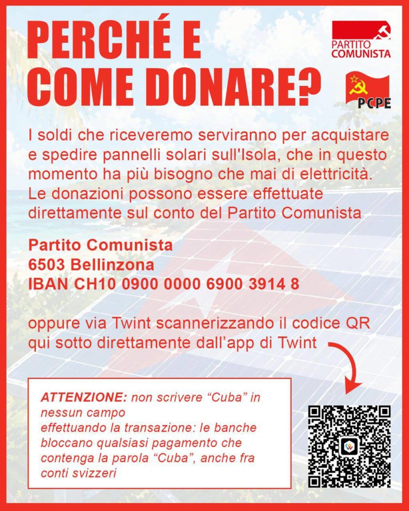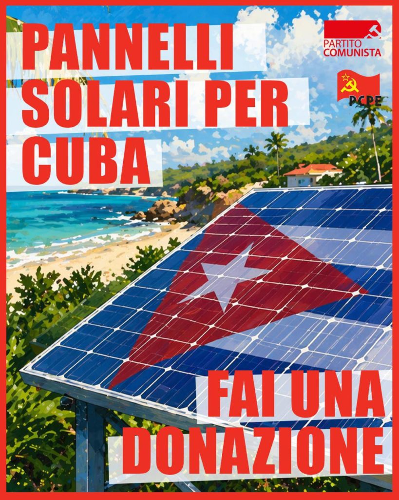 Insieme al Partito Comunista del Popoli di Spagna (PCPE), abbiamo lanciato una raccolta fondi per acquistare pannelli solari che verranno poi inviati a Cuba. In questo momento, fra le mille difficoltà dell’isola, una di quelle che si fa sempre più sentire è quella della mancanza di elettricità e dei continui blackout. Il blocco economico stringe Cuba sempre di più e serve la massima solidarietà al popolo cubano e ai compagni del PCC che si stanno impegnando al massimo per affrontare questo tremendo assedio.