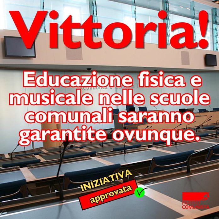 Il Partito Comunista si felicita del fatto che il Gran Consiglio abbia approvato ieri sera a larga maggioranza l’iniziativa parlamentare “Musica e sport non valgono meno delle arti plastiche” dei propri deputati Massimiliano Ay e Lea Ferrari, atta a inserire nella Legge sulla scuola dell’infanzia e sulla scuola elementare che sia l’educazione fisica sia l’educazione musicale siano garantite nelle scuole comunali da docenti specialisti adeguatamente formati, come lo è già attualmente l’insegnamento delle arti plastiche.